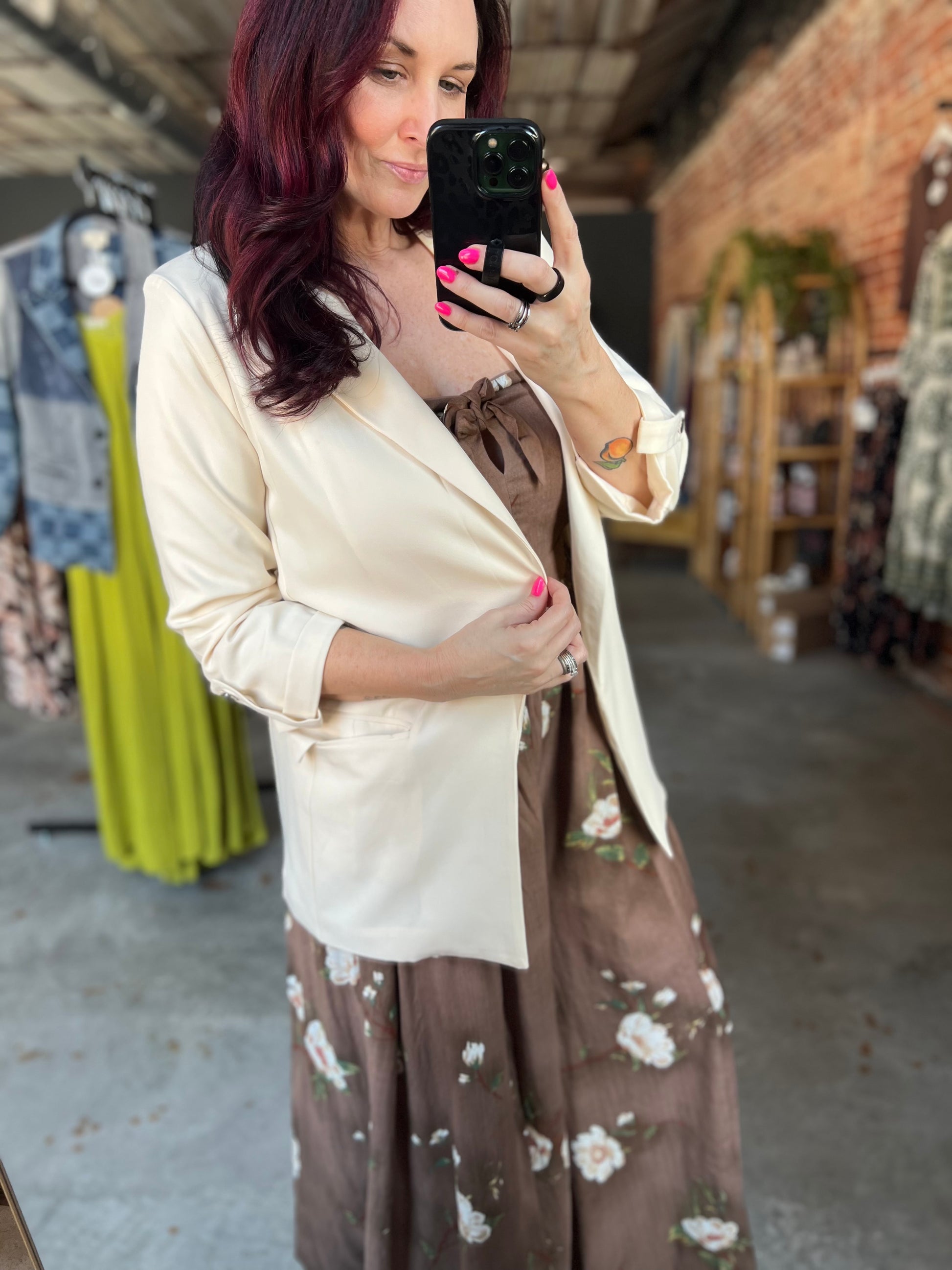 Effortlessly chic and versatile, this long blazer features an open front and classic lapel neckline. The loose fit allows for comfortable wear and the long rolled-up sleeves add a touch of style. Complete with front pocket flaps, this blazer can be dressed up or down for any occasion. Perfect with pants or denim.