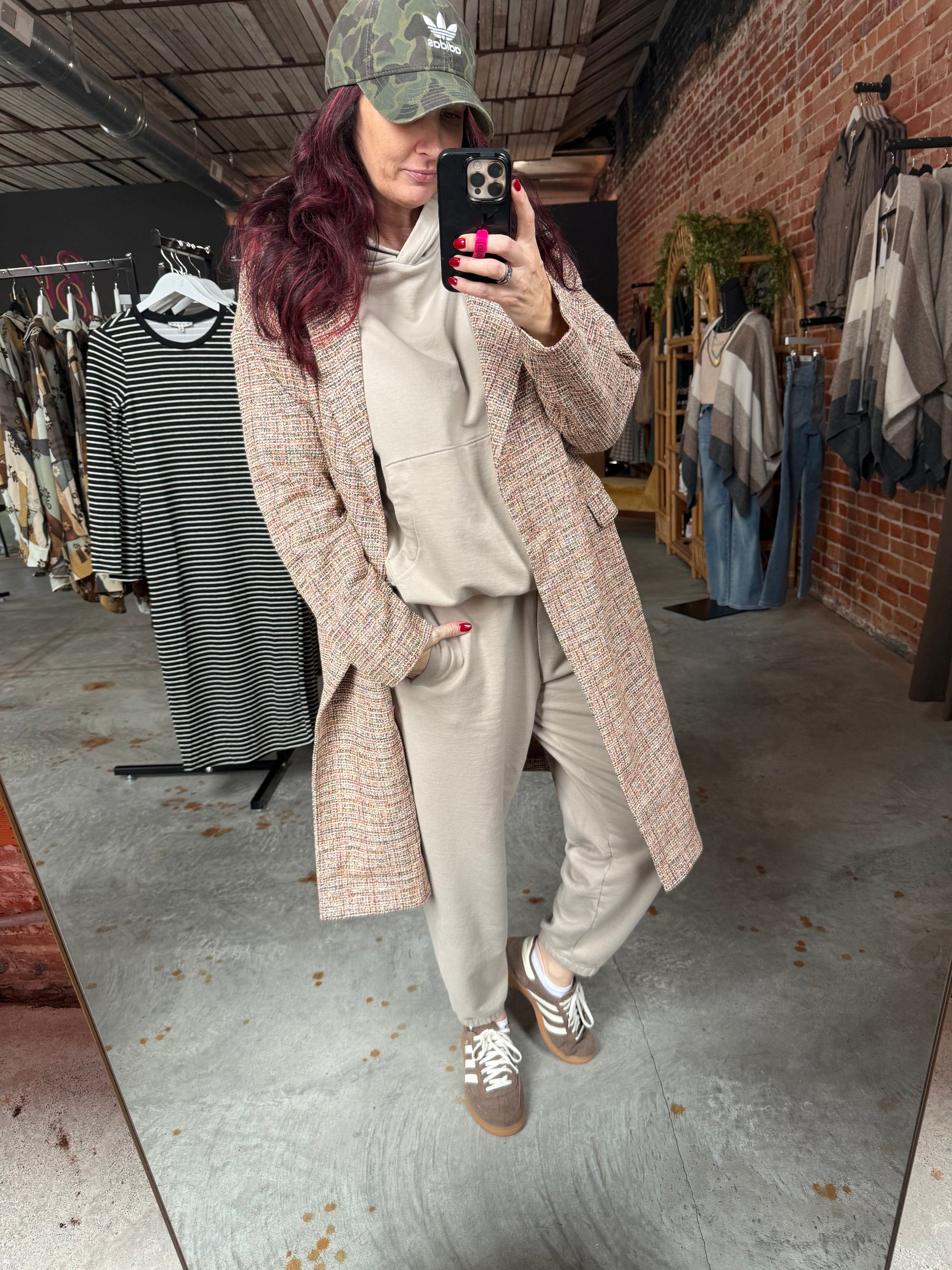 Wrap yourself in cozy charm with the Double Button Tweed Coat in Blush Grey. Featuring long sleeves, a notched lapel collar, and relaxed dropped shoulders, this coat blends comfort with casual chic. The longline silhouette and double button closure create an effortlessly stylish look, while front pockets keep essentials close. Perfect for layering and making a statement wherever you go!