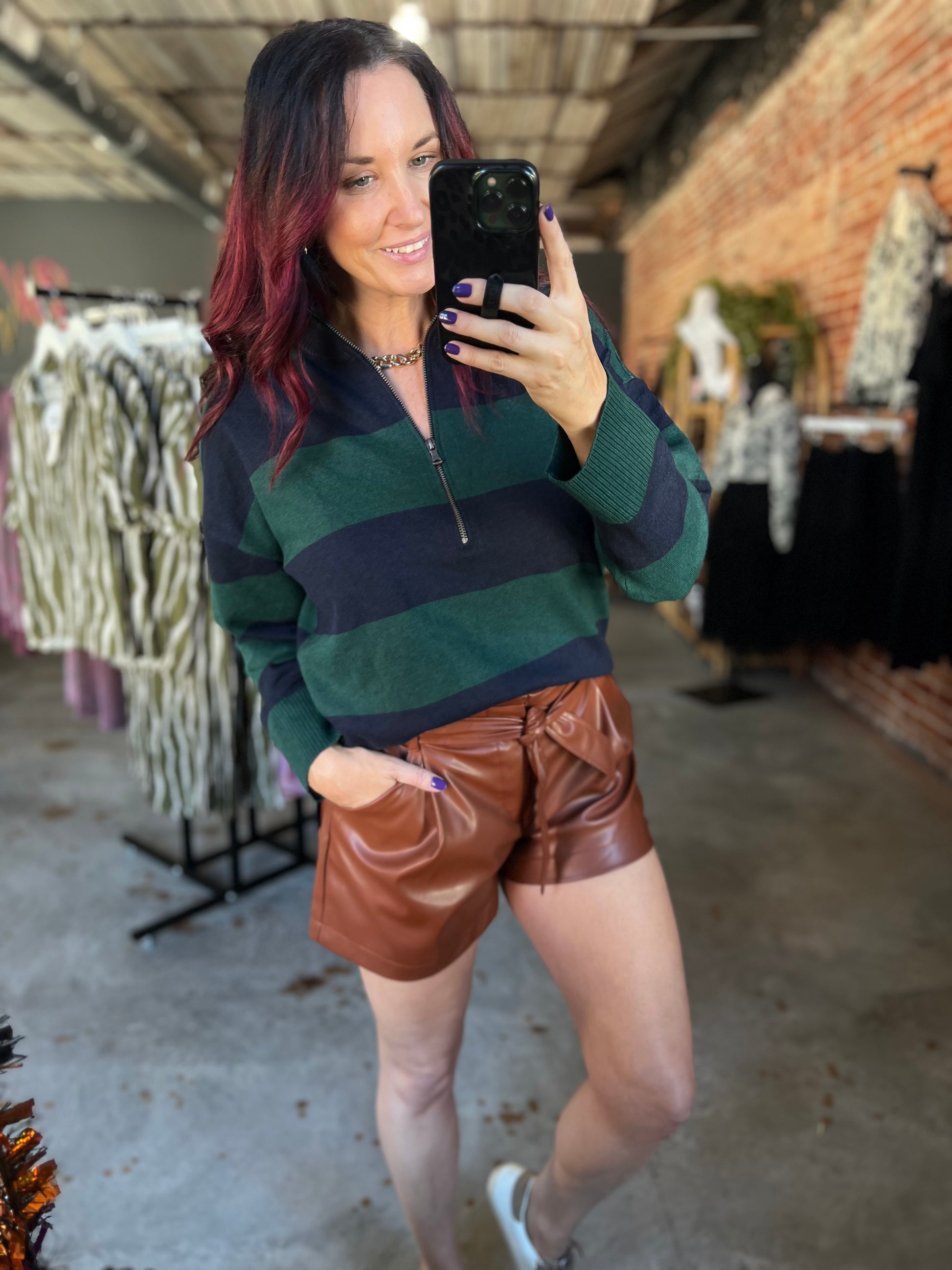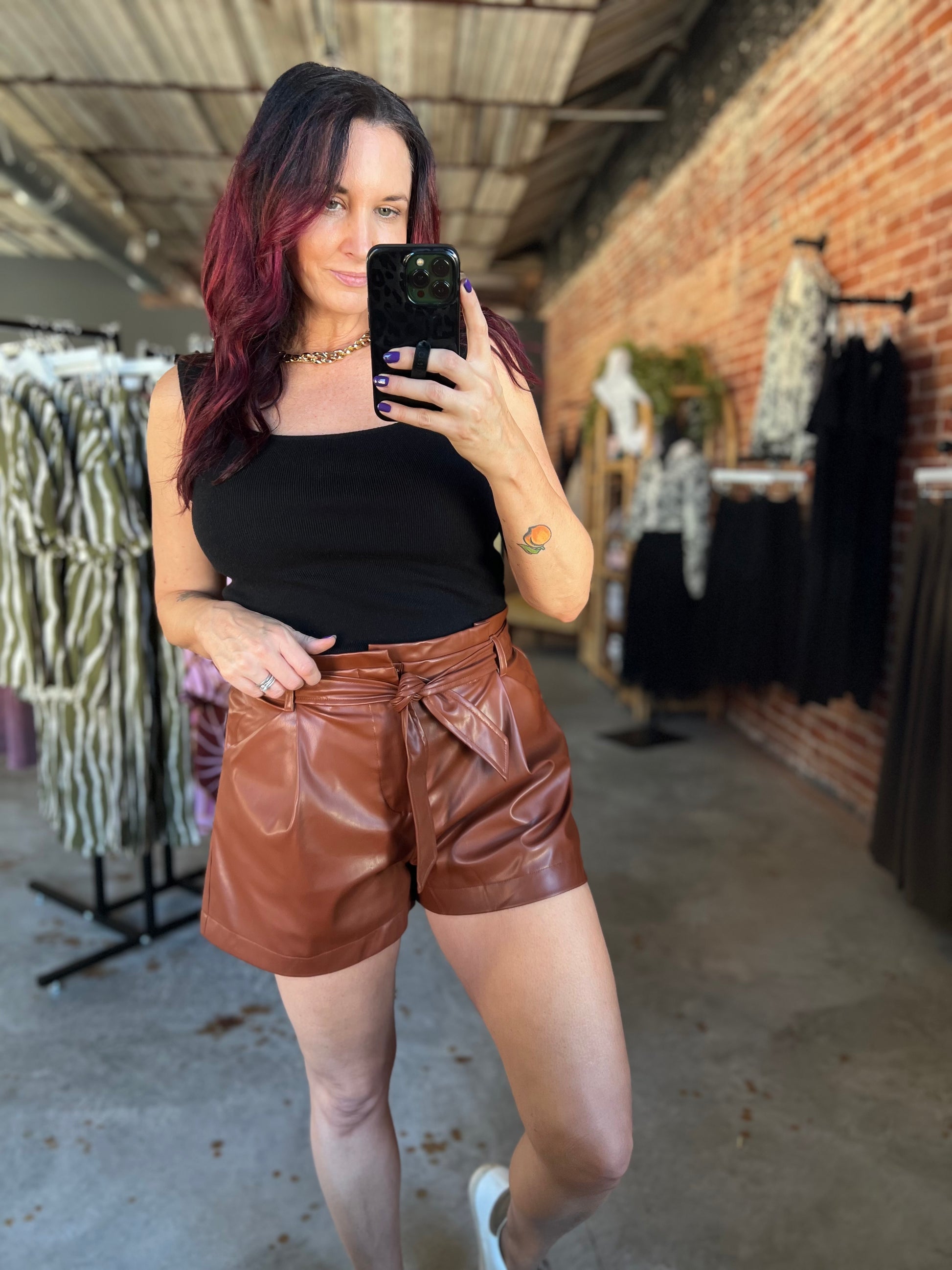 Stylish faux leather shorts are a versatile and trendy piece of clothing that can be dressed up or down. They are made from a soft and supple material that drapes beautifully over the body, and the belt and pockets add a touch of sophistication and functionality.