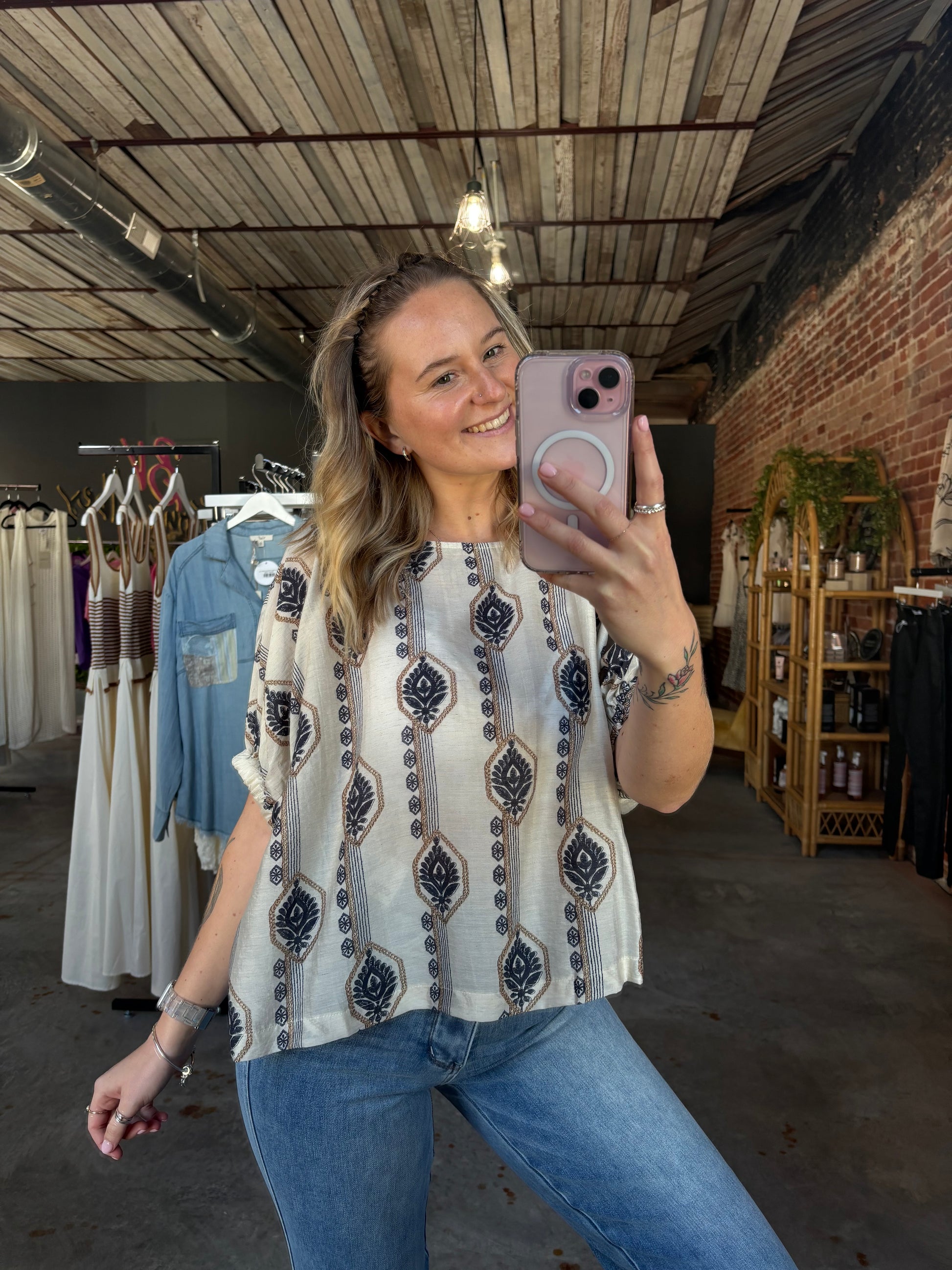 This breezy printed top brings playful vibes with its boxy, relaxed fit and dolman elasticized sleeves that move with you. The wide scoop neckline adds a flirty touch, while the vertical tile-inspired floral stripe blends vintage charm with a modern twist. Perfect for effortless, easygoing style wherever you go!