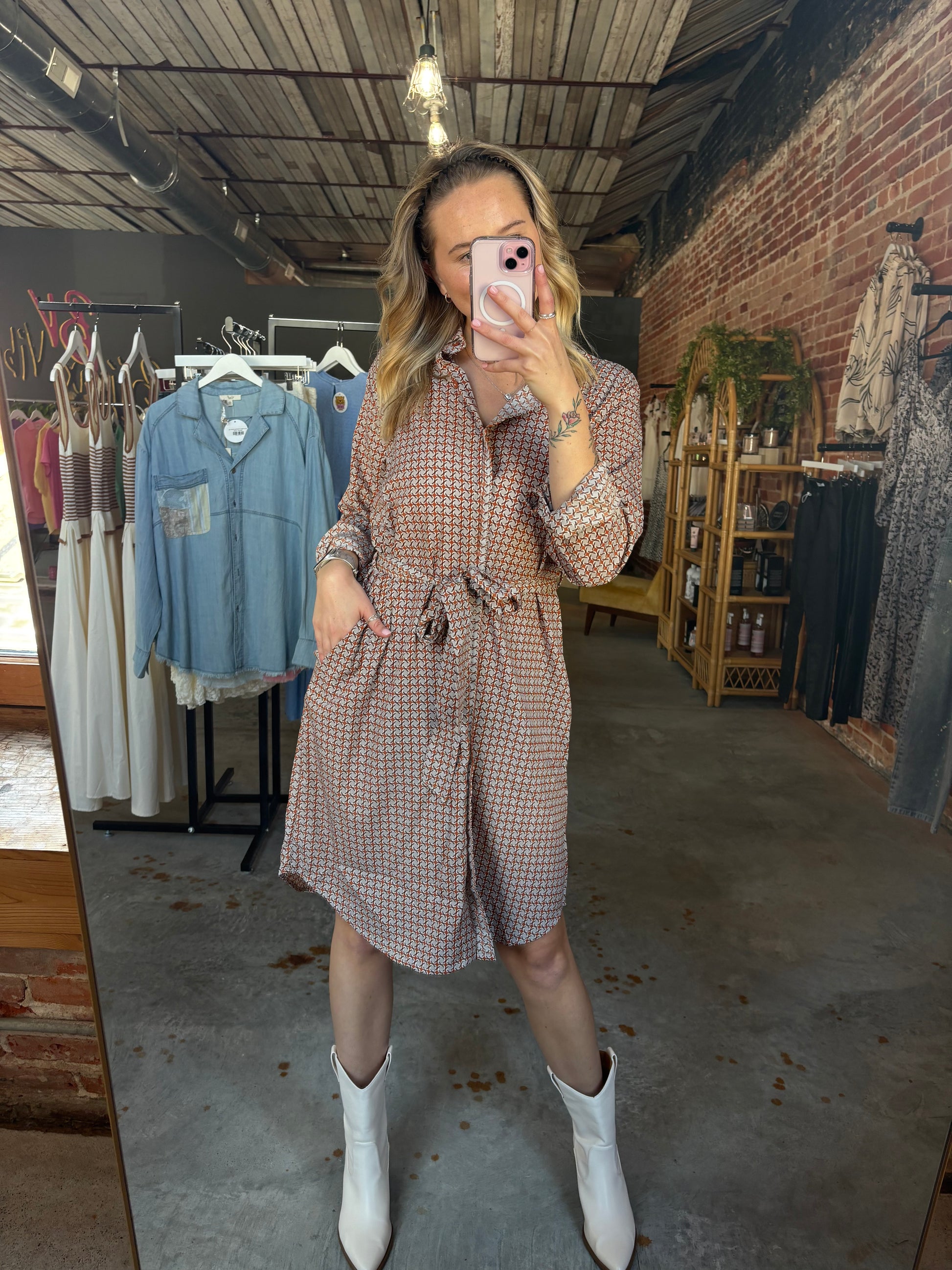 Embrace effortless style with this geomatic printed dress featuring a chic collared neckline and a button-down front for easy wear. The belted waist adds a flirty shape while side pockets keep essentials close. Its slouchy, loose fit ensures all-day comfort with a carefree vibe perfect for playful days out.