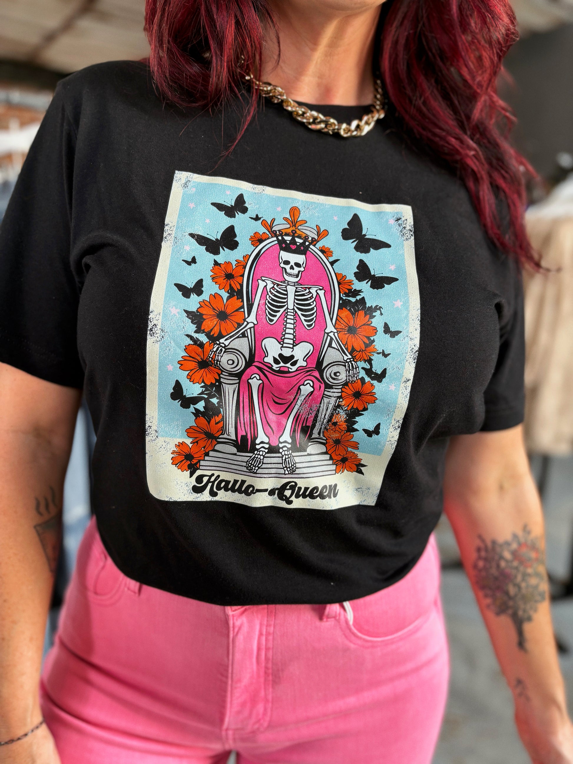 Unleash your inner queen with HALLO QUEEN graphic tee! Perfect for making a statement and showing off your regal side. Rule the day with this fun and stylish shirt.