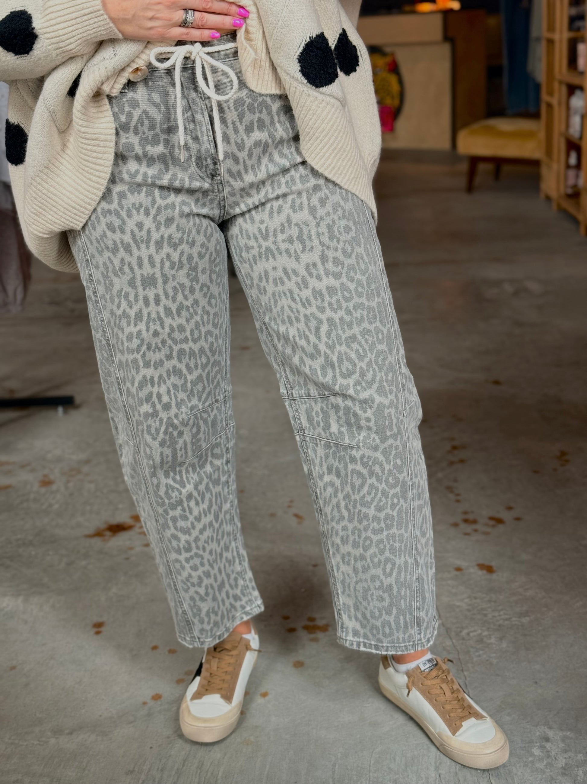 Elevate your denim game with these high-rise barrel jeans that blend comfort and style effortlessly. Crafted from stretch denim, they feature a flattering cropped silhouette, five functional pockets, and an adjustable corded drawstring waist for the perfect fit. The grey leopard print adds a bold, playful edge to your everyday wardrobe. Finished with a clean hem, these jeans transition seamlessly from casual outings to weekend adventures. Pure comfort meets fierce fashion.