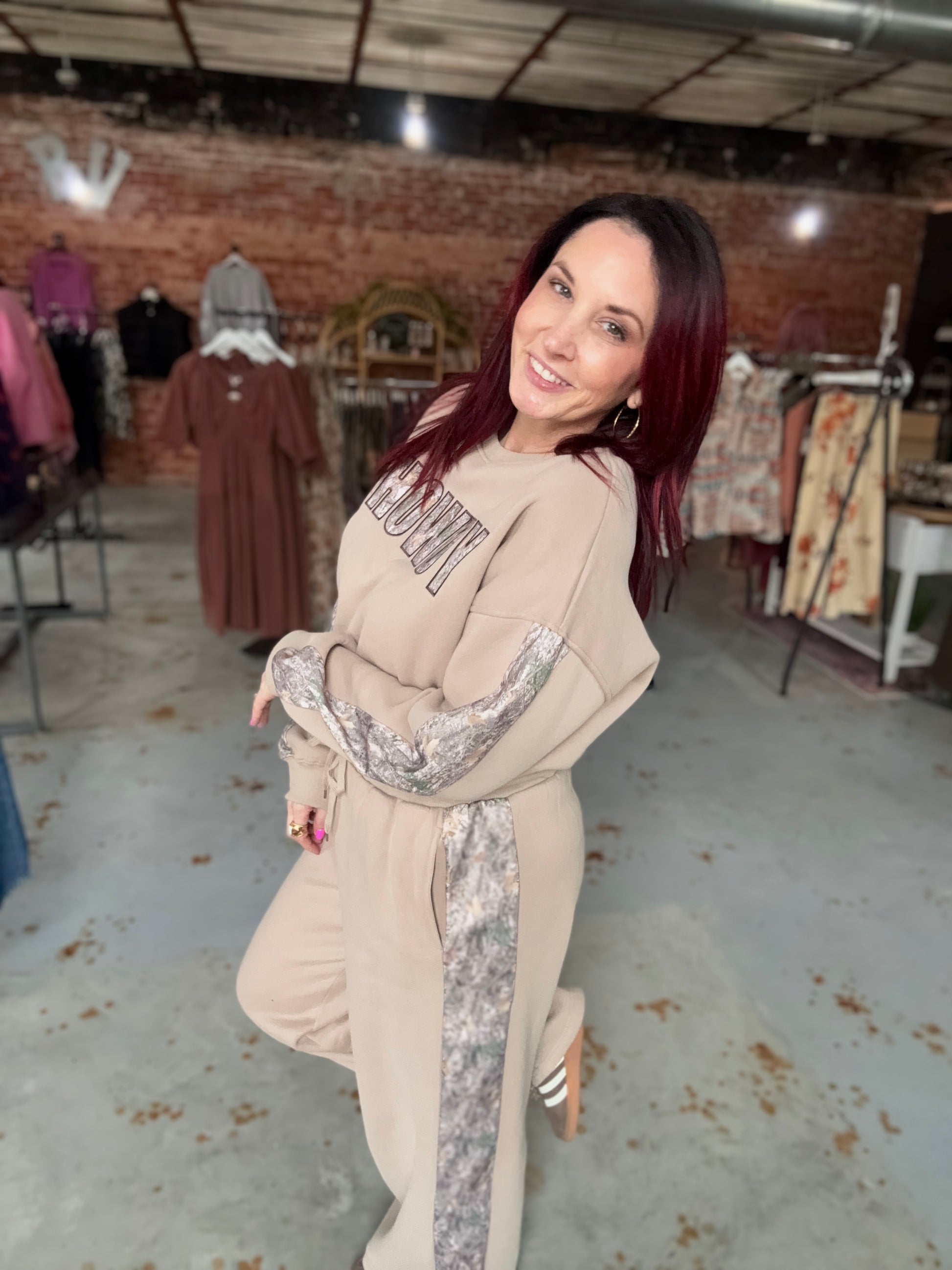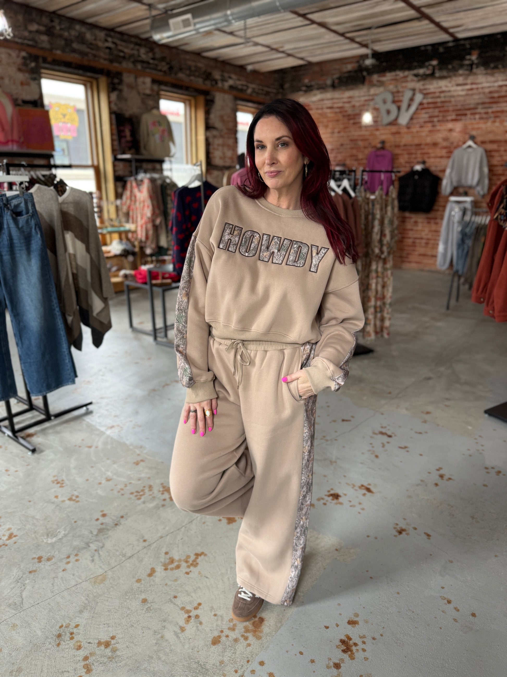 These new cozy comfy pant and pullover sets are ultimate comfort! Trust us, you will want to live in them! Super soft and stretchy, the matching camo howdy embroidered font matches the camo stripe down the pants.