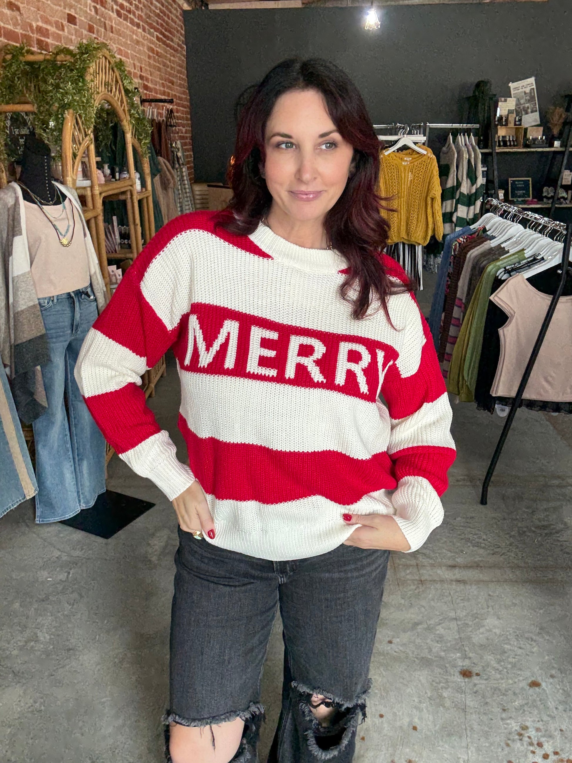 Get cozy and cheerful this season with the Merry Striped Sweater! Featuring festive lettering and vibrant stripes, this playful top adds instant holiday spirit to your wardrobe. Perfect for parties or snuggling by the fire, it’s a fun way to spread joy all season long.
