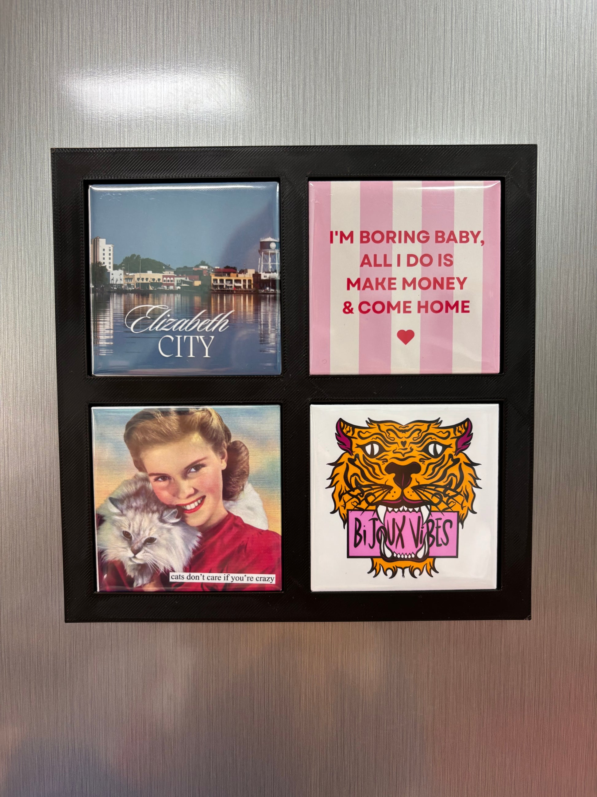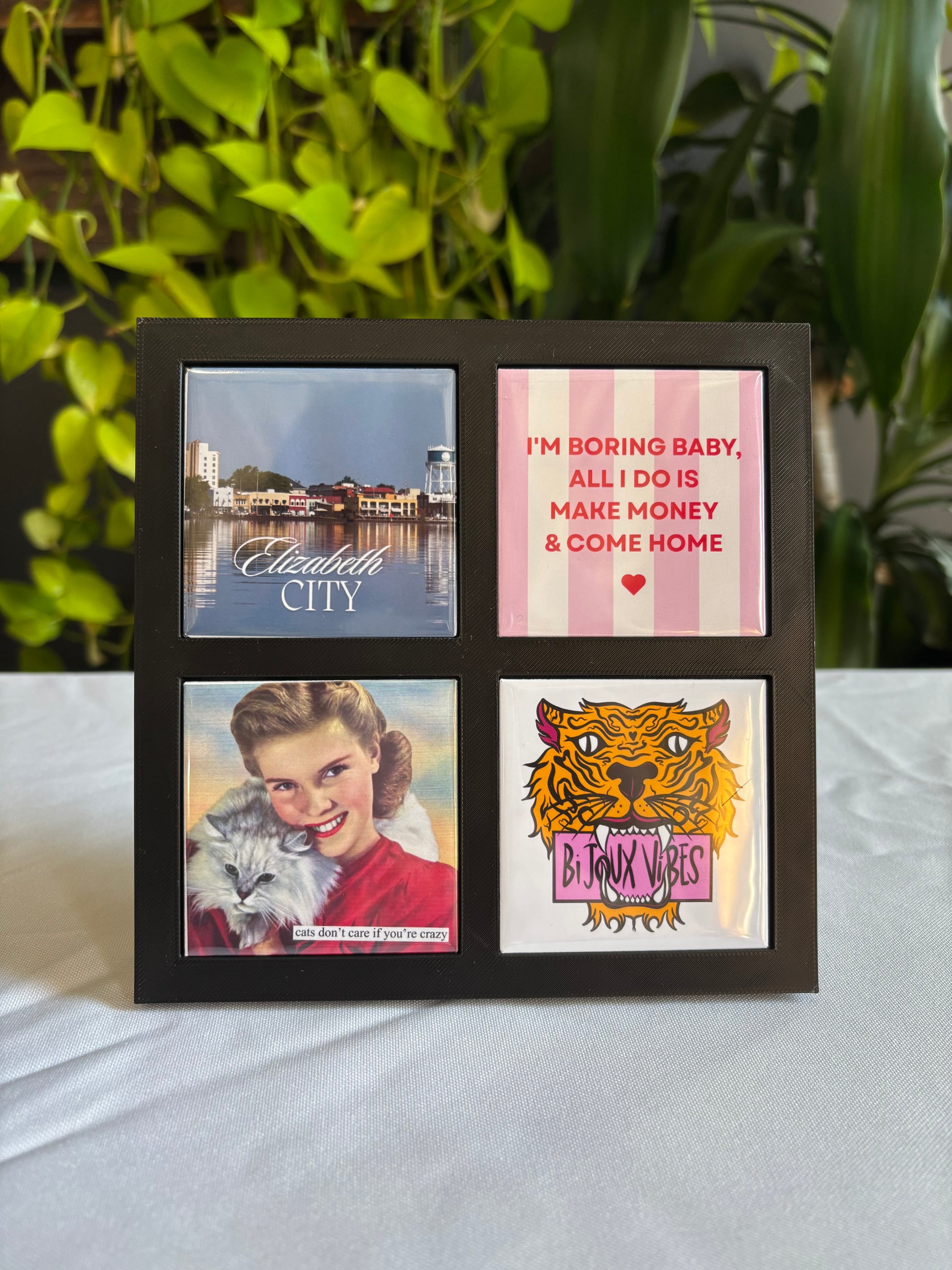 Show off your favorite memories with this fun Photo + Frame Combo! Pick four photos to turn into magnets, then display them all together in a frame that stands on its own or sticks right to your fridge. It’s the perfect way to keep your best moments close and add a playful touch to your space.