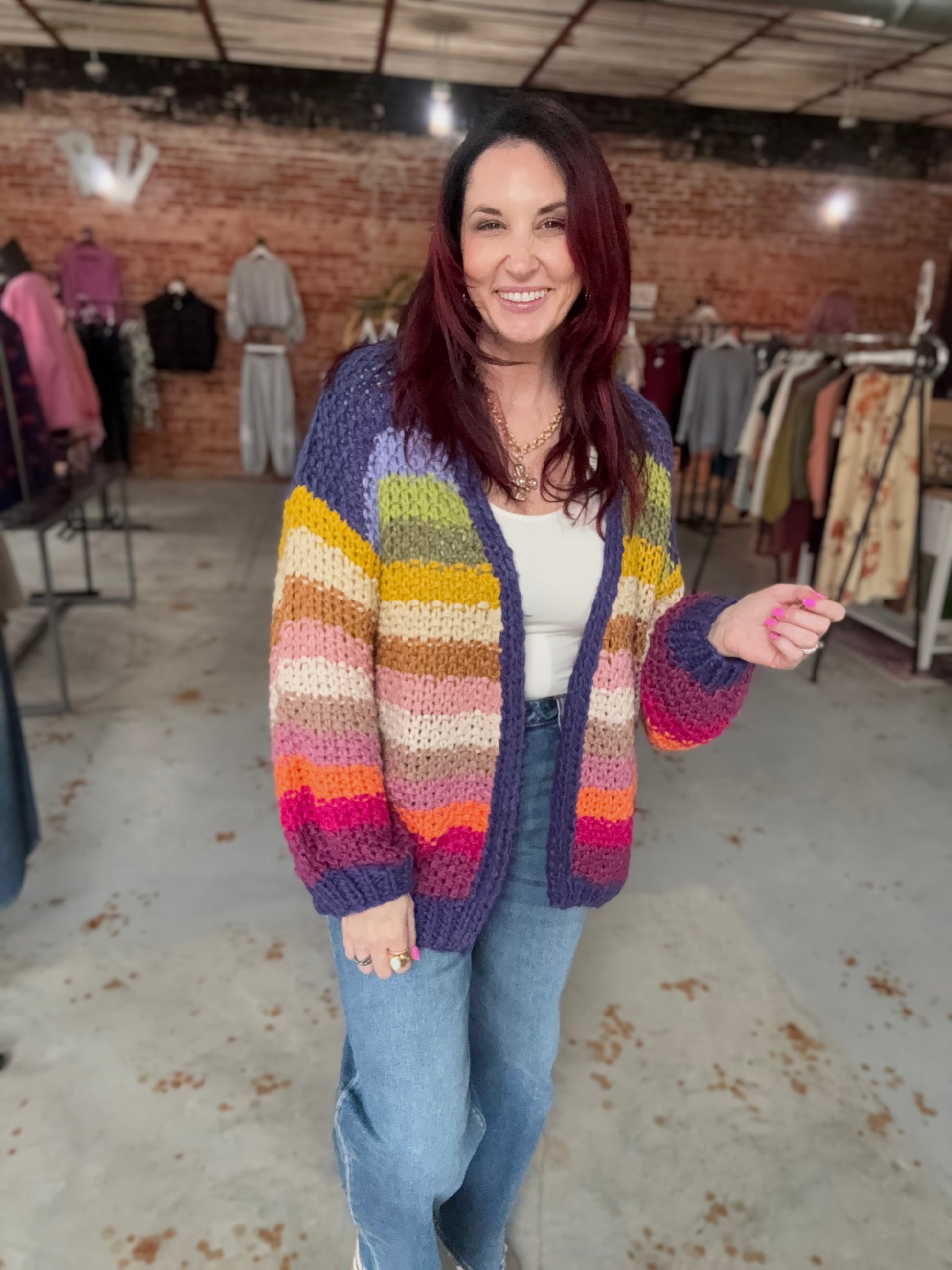 Wrap yourself in vibrant, handcrafted charm with this oversized rainbow crochet cardigan. Perfect for layering over your favorite tees or dresses, this open-front beauty brings instant color and texture to any outfit. The relaxed fit offers cozy comfort while the multicolor design celebrates bold self-expression. Whether you're heading out for a casual day or adding flair to your everyday look, this statement piece is sure to turn heads and spark joy.