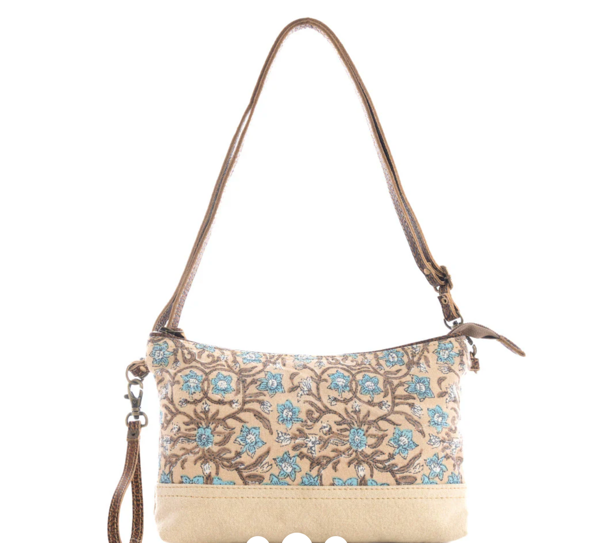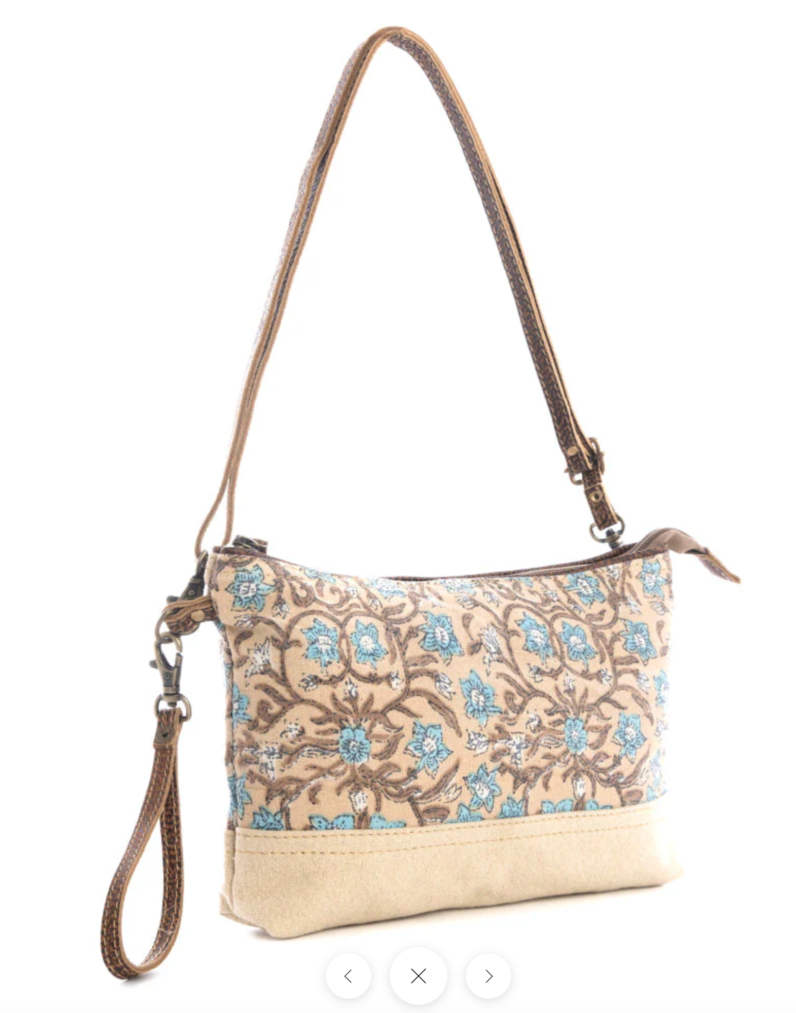 Subtle, stylish and alluring, this bag presents an enchanting floral pattern. The scene of serene foliage is embraced by soft taupe woven canvas, expertly stitched to perfection. The back includes an extra zippered pocket; the wristlet carrying strap and the detachable, adjustable shoulder strap are in matching leather. A versatile and charming bag you'll cherish!.