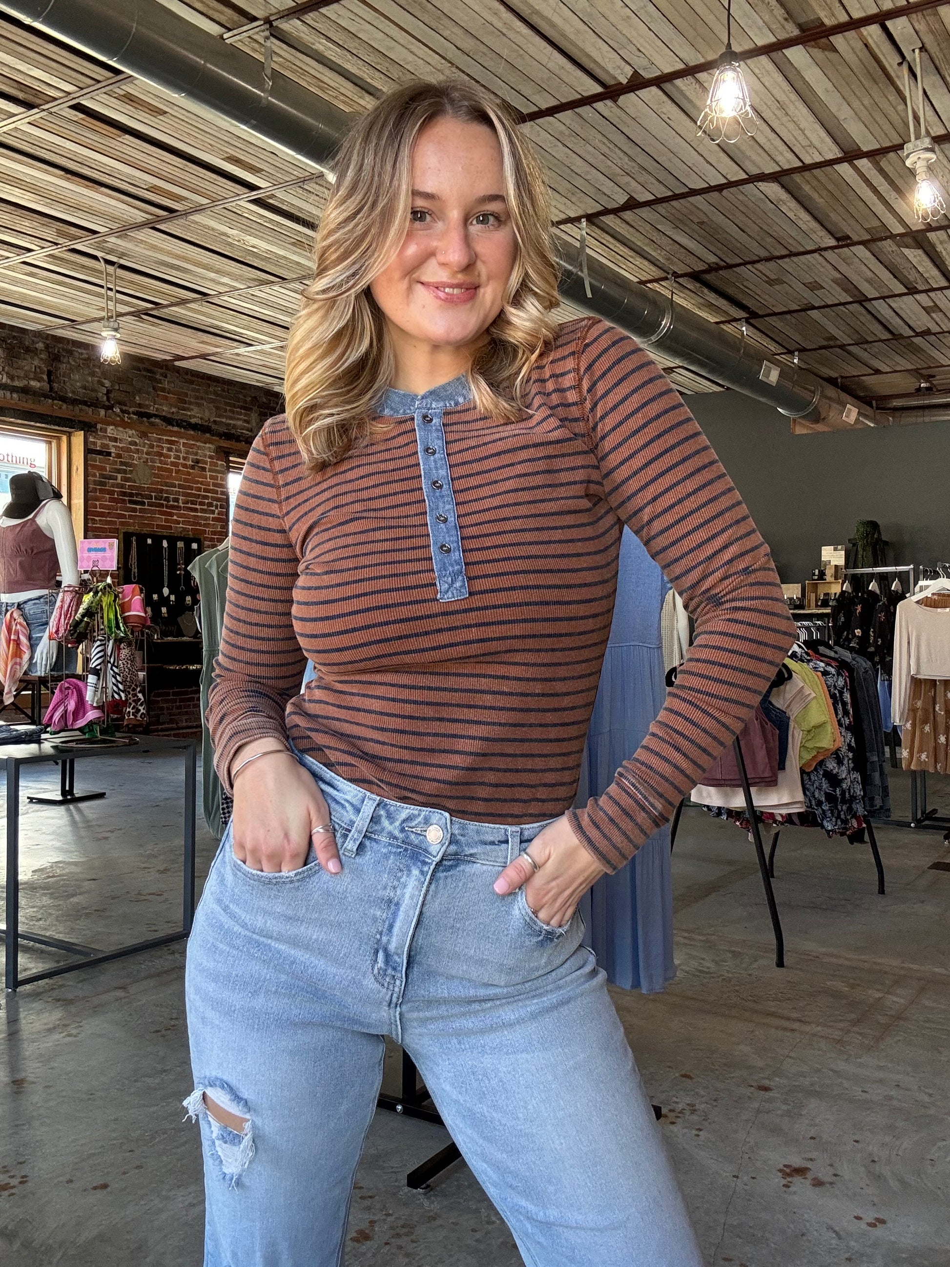 Bring some fun to your wardrobe with this Snow Wash Two Tone Button Down Top. Featuring playful contrast stripes all over and a slim, structured fit, it adds a flirty edge to any outfit. The denim-trimmed button front gives a cool, casual vibe while keeping things timeless. Perfect for mixing and matching on those laid-back days!