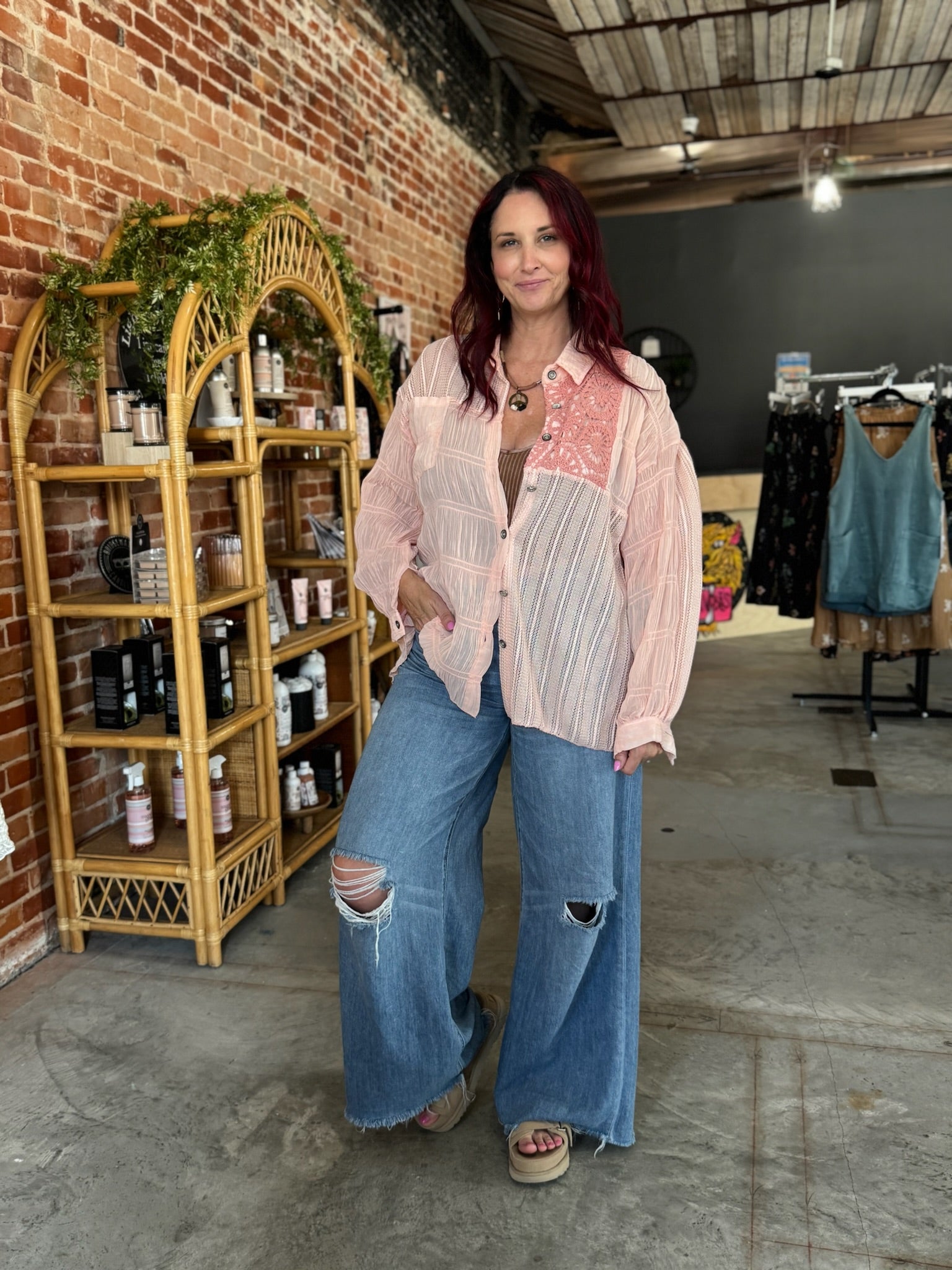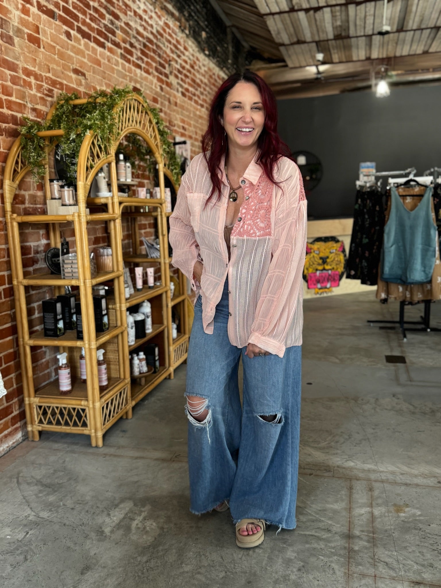 This playful pinky peach top features a delightful mix of textures and a flowy fit that moves with you. The standout crochet detail on the back shoulder adds a charming, breezy touch perfect for sunny days or casual outings. Embrace comfort and style effortlessly with this unique, eye-catching piece.